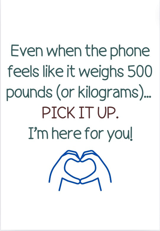 When they open the card, they will see some of the most popular slogans and acronyms used in these circles and a greeting on the other side that reads "Even when the phone feels like it weighs 500 pounds (or kilograms) PICK IT UP. I'm here for you." (please see the video and photos)