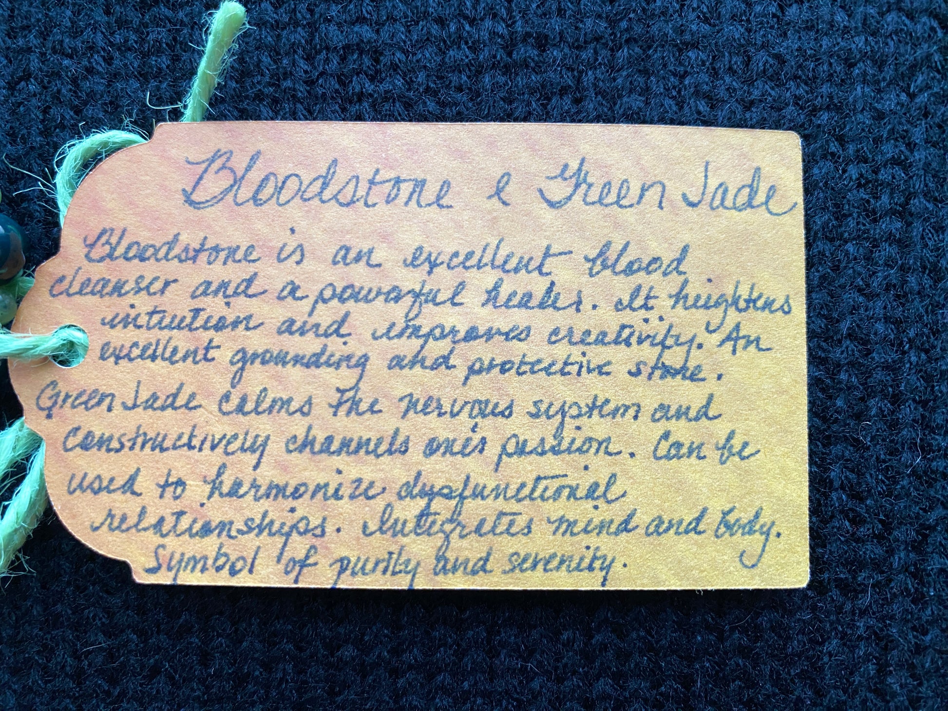 Bloodstone brings peace of mind, strengthens the mind, and reduces irritability. Helps people avoid dangerous situations and chaos by bringing objectivity to the situation. Some believe it heightens intuition, enhances the power of persuasion, or getting what one wants. Also helps people deal in uncomfortable situations.