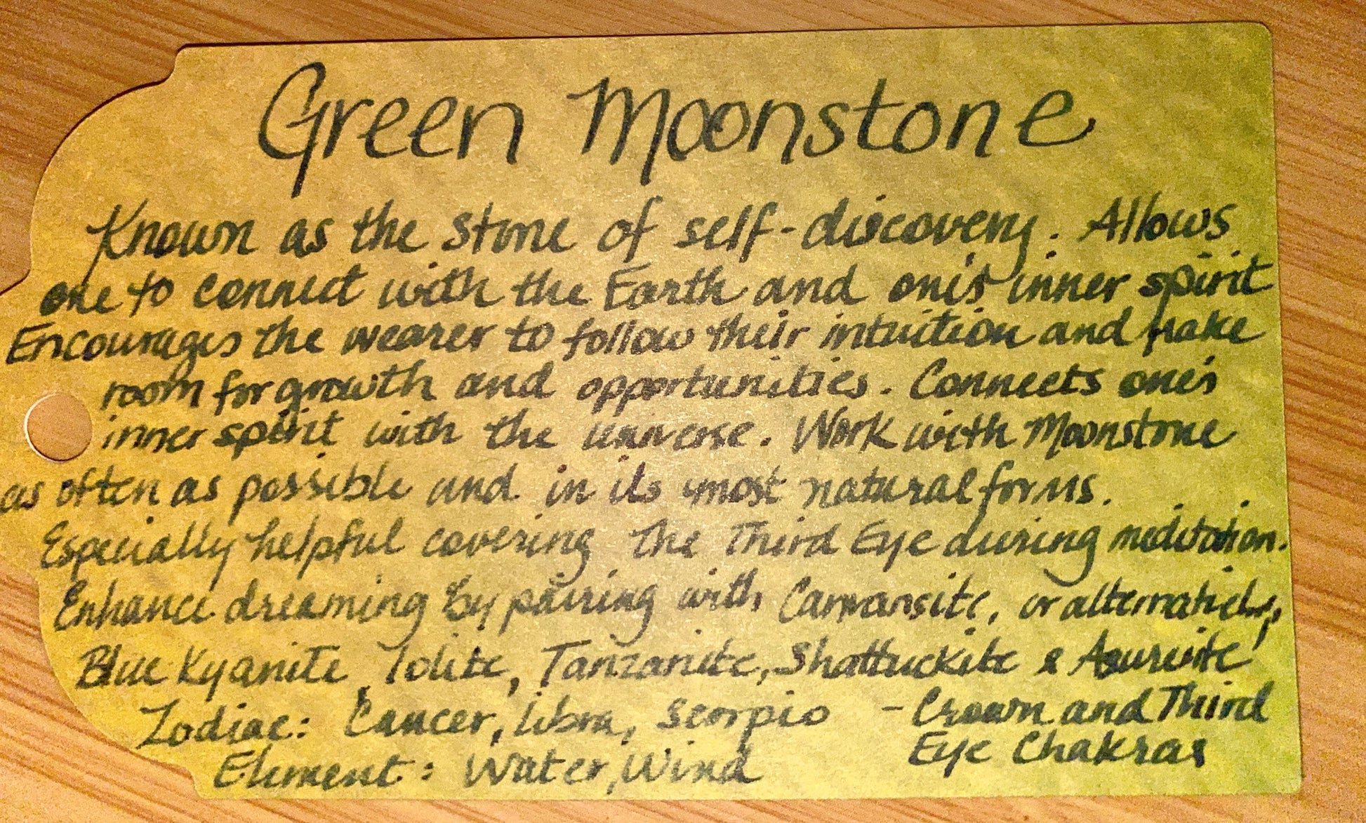 Green Moonstone is a variety of Moonstone. It is a potassium aluminum silicate feldspar. The color is usually a tan brown to a very light peach/pink (these colors are able to be seen easier in direct sunlight). This change in color is believed to be caused from higher contents of aluminum within the feldspar’s chemical make-up.